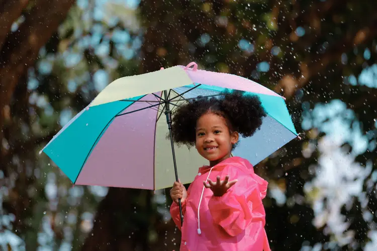 en jente som holder paraply og kledd i regnklær
