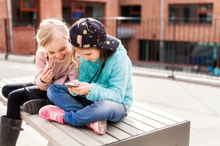 To jenter som sitter i skolegården mens de ser på en mobil