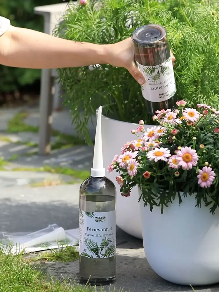 Mester Grønn sine ferievannere kan hjelpe til med å holde plantene friske og fine mens du er borte noen dager. Du kan velge mellom to ulike varianter, en i gjennomsiktig glass, og en pakke med fire ferievannere som kan festes på tomme brusflasker (passer ikke Coca cola sine nye flasker). Det første du må gjøre er å sette det som kan flyttes i så mye skygge som mulig, og vanne godt slik at jorden er fuktig. Så fyller du en flaske med vann, skrur ferievanneren på flasken og setter den på hodet oppi blomsterpotta.
