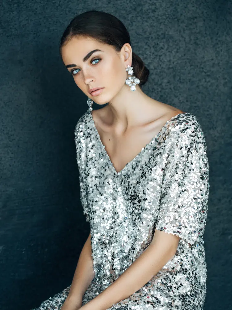 Fordelen med å velge en kjole eller skjørt med paljetter, er at du ikke trenger å gjøre så mye med håret eller slå på stortromma med smykkene, siden kjolen gjør jobben for deg.