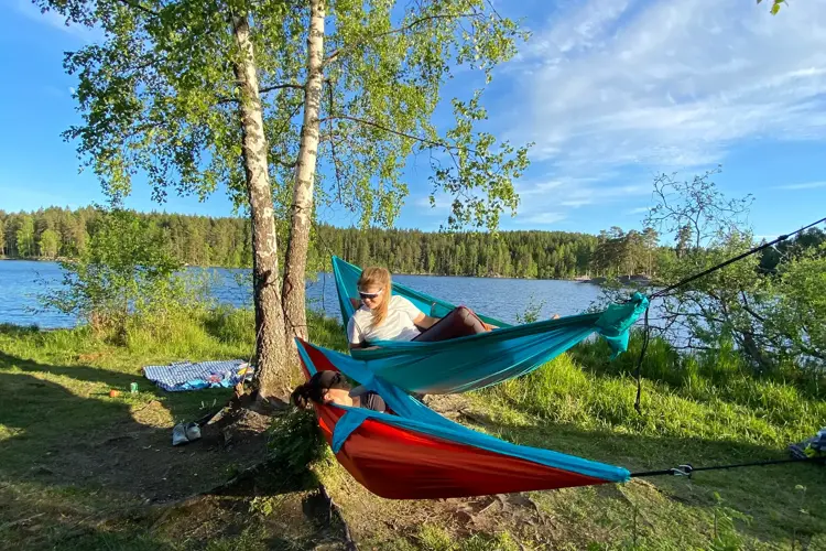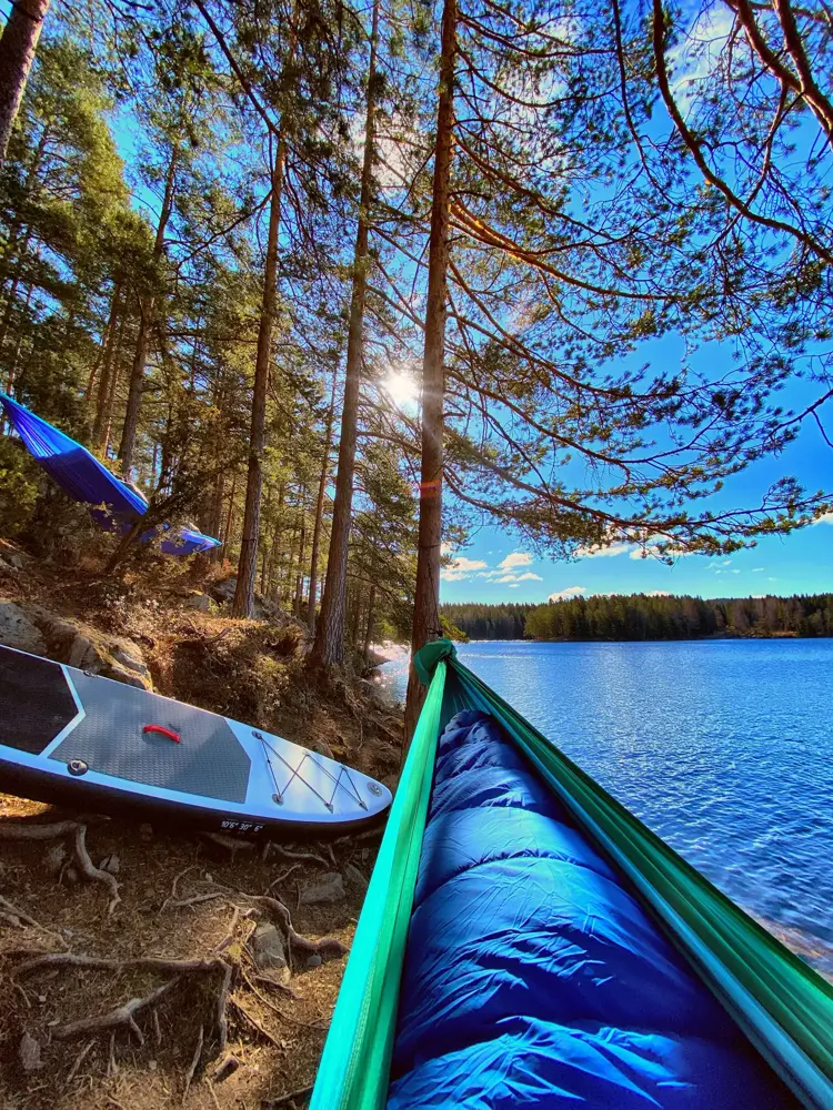 Tips! Det kan være lurt å henge opp hengekøya hjemme eller på en uteplass i nærheten før du drar ut på tur. Dette er en fin måte å dobbeltsjekket at alle delene faktisk følger med, og du rekker å øve litt på hvordan den skal henges opp og strammes til.