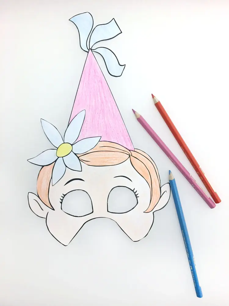 Finn frem saks og spisse fargeblyanter! Her er alt du trenger for å lage en morsom maske til å kle seg ut med.