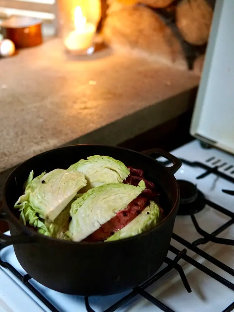 - Legg kjøtt og kål lagvis i en gryte og strø salt og pepper mellom lagene.