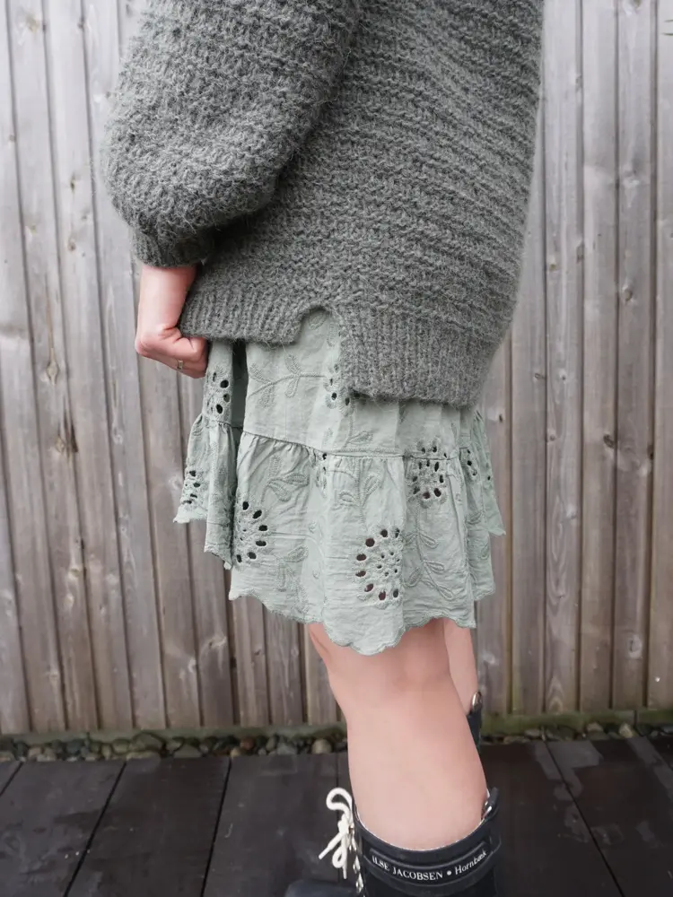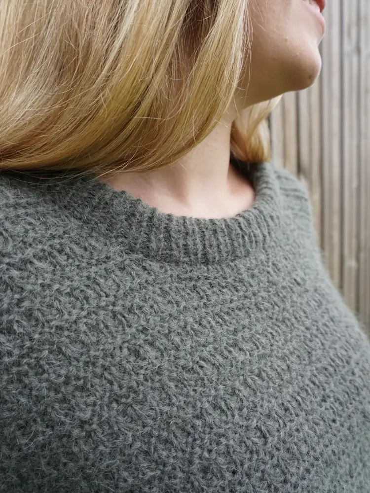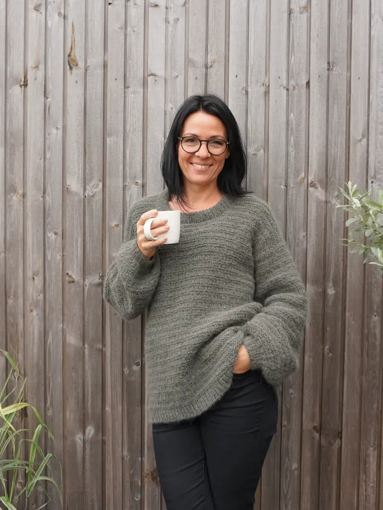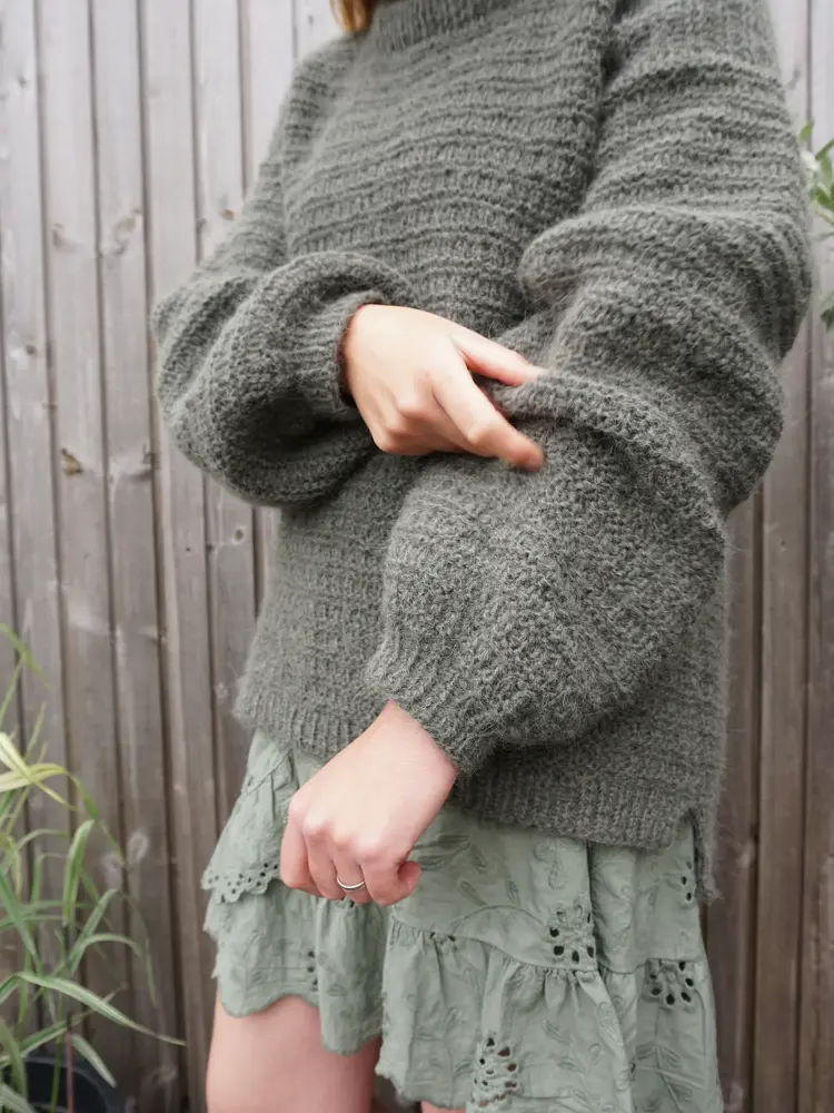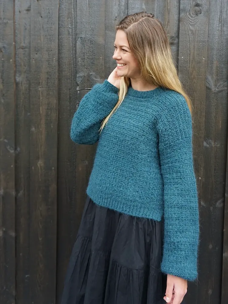 - Da jeg skulle designe TREND-genseren falt valget på en litt kort modell med vide armer – perfekt til blant annet highwaist-bukser og over kjoler. Tanken er at den også kan strikkes som en vest dersom du ønsker det. Jeg har også laget oppskrift på en matchende hals, forklarer Marte.