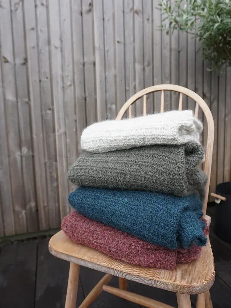 - Du kan godt velge et annet garn eller en kombinasjon av garn som tilsvarer strikkefastheten. Strikk deg en prøvelapp, slik at du ser hvordan det blir og husk å sjekke garnlengden slik at du får nok garn, tipser Marte.