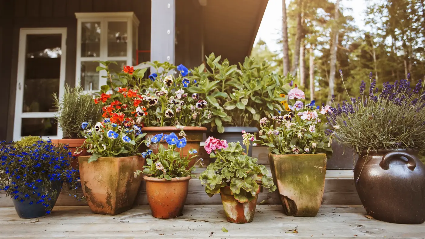 Blomster i krukker på terrasse