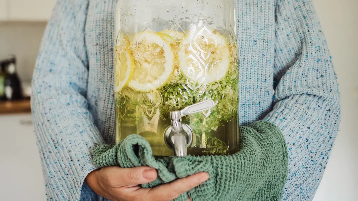 Servér drikken fra store gjennomsiktige karafler eller krukker med tappekran, som du setter på et eget bord.