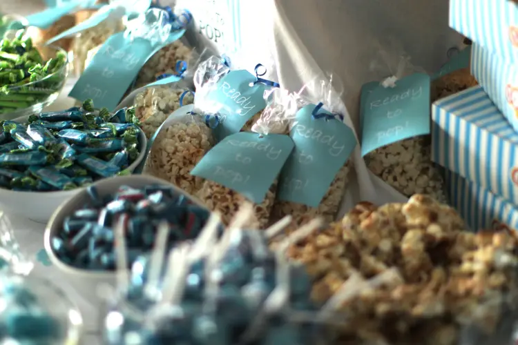 Vil du gjøre litt mer ut av det kan du lage små goodiebags av papirposer som du fyller med forskjellig godteri til hver av gjestene. Eller du kan putte popcorn i små porsjonsposer av cellofan med sløyfe rundt – og spille på at dere venter på at magen skal «poppe».