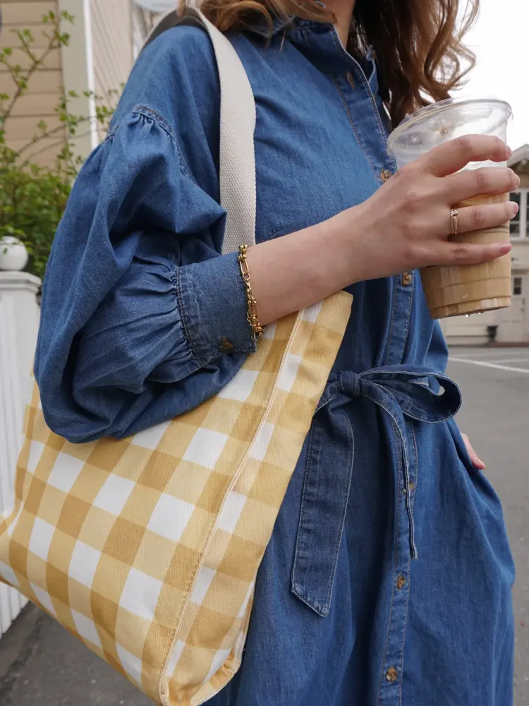 Tips! Sprit opp antrekket ved å gå for en veske i en fresh farge. Hva med å gå til innkjøp av en shopper bag med gule og hvite ruter?