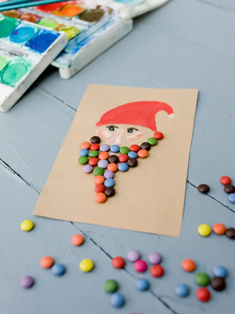 Det er ikke bare julegavene som kan lages for hånd. Dette hjemmelagde julekortet skiller seg ut blant de maskinproduserte, særlig med nissefar sitt spiselige skjegg. Skriv en hyggelig hilsen på baksiden og legg ved julegaven.